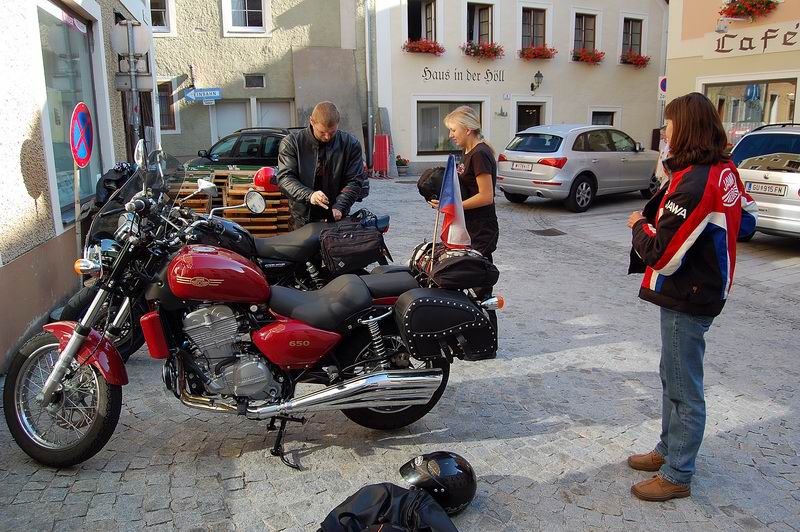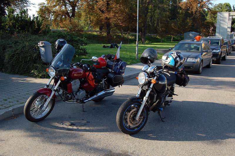 Hned jsem toho využil a zeptal se ho, jestli musíme mít na motorku dálniční známku. Říkal, že ano a že nejkratší je na 3 dny. Cenu za známku už nevěděl. Ještě se mě ptal, jestli v Čechách musíme mít taky dálniční známku. Říkal jsem mu, že jo, ale jen na auta. Snídaně byla opravdu vydatná. Těsně před devátou jsme šli balit, protože v devět byl plánován výjezd. Naložili jsme věci na mašiny, trochu je zahřáli a hurá na cestu. Myslím si, že to hurá jsme říkali všichni nadšeně, ale to jsme ještě přesně nevěděli do čeho jdeme a co nás čeká.