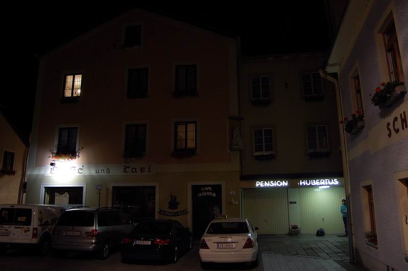 Bylo jasný, že na pension do 21:00 nepřijedeme. Z Budějovic jsme vyrazili lehce po deváté. Před tím jsem volal na pension, že přijedeme později. Babča z toho nadšená nebyla. Říkala, že máme přijet, co nejdříve. Už byla tma a dost dlouho nám trvalo, než jsme vyjeli z Budějovic. Do Freistadtu jsme přijeli před půl jedenáctou. Panovaly vážné obavy, že budeme spát venku. Podle GPS jsme si objeli krásně město a pak jsme dorazili na pension. Tam už bylo zavřeno. Naštěstí byl u dveří zvonek. Tak jsem na něj zazvonil. Z okna se vyklonila stará, neestetická a přinasraná paní. Tak jsem se jí představil a řekl, že máme rezervované pokoje. Říkala mi, že jsme měli přijet ve 22:00. Když vyšla ven, tak nás ohromila svým "fantastickým" županem a kamenným obličejem. Dala nám úvodní instruktáž a pak už jsme šli vybalovat věci. Pension byl opravdu nádherný. Dostali jsme pokoje č. 2 a č. 5. Ubytovali jsme se, vzali pivka a šli plánovat zítřejší cestu. Na pokoji č. 5 byl pavouk. Zlikvidovali jsme ho voňavkou.