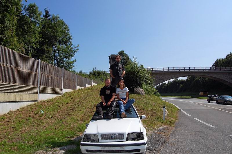 V první etapě jsme ujeli kolem 160km. Nutno říci, že je to slušný výkon. První zastávka byla kousek před Salzburgem. Potřeboval jsem se podívat do mapy, jestli jedem dobře a jakým směrem pojedeme ze Salzburgu. Na parkovišti, na kterém jsme stáli, bylo nepojízdné Volvo. Bylo vidět, že už tam nějaký ten pátek stojí. Chyběla mu světla a dvě kola. udělali jsme pár fotek a razili dál na cestu.