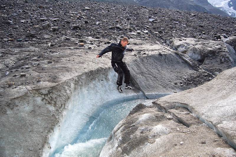Stále jsme ale nebyli ani v půlce cesty. Pořád jsme klesali a klesali a klesali až jsme dorazili na ledovec. Cestou jsme míjeli cedule, kde byl rok a stav ledovce v tom roce. Cedule byly odstupňovány po 5 letech. Teprve tady člověk viděl, jakou rychlostí ledovec ustupuje. Vydali jsme se prozkoumat pukliny, které jsme viděli z výšky. Při chůzi po ledovci to pod nohama zvláštně praskalo. Byl to praskot tvrdého ledu a kamínků, které na něm byly. Na ledovci byly také úzké pukliny, do kterých zatékala voda a nikdo nevěděl, jak jsou hluboké. My s Michalem jsme šli dál k velkým puklinám, ale holky se už bály a tak se vydali na cestu zpět.