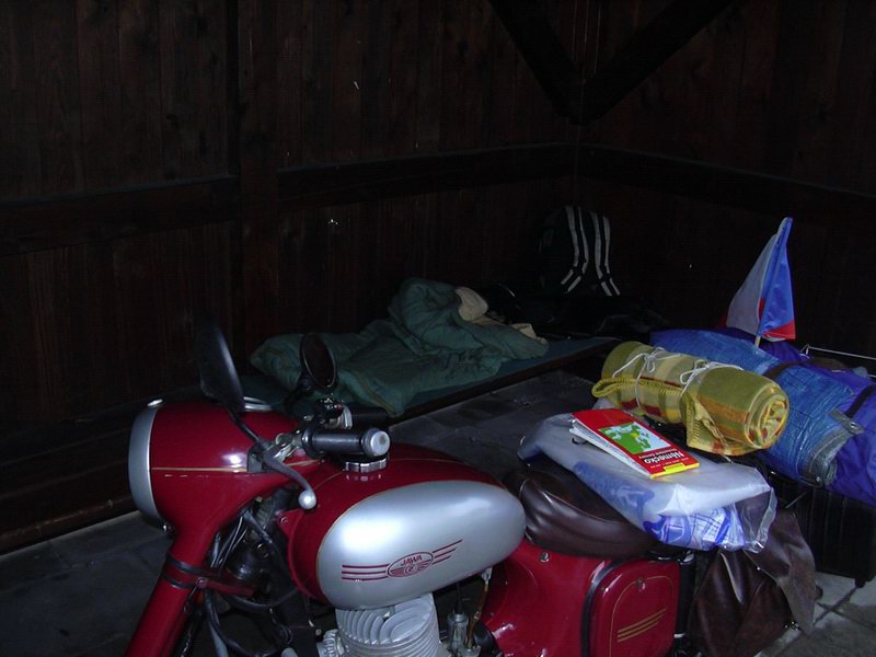 Venku bylo hotové peklo. Blesky lítaly všude kolem mě a kolem zastávky. Spát v lese by bylo hodně nebezpečný. Mezitím co jsem ležel a pomalu usínal déšť přidal na intenzitě, takže začalo zatékat i do zastávky. Z igelitu jsem udělal zábranu tak, aby se voda nedostala až na spacák. Já jsem se sbalil do klubíčka a byl jsem v jednom rohu zastávky. Jak pršelo, tak se podmáčela země pod motorkou a motorka spadla na zem. Tak jsem fofrem vylezl ze spacáku a snažil se ji postavit. Dalo mi to pěkně zabrat. Pak už jsem pomalu usnul a modlil se, aby zítra bylo pěkně.