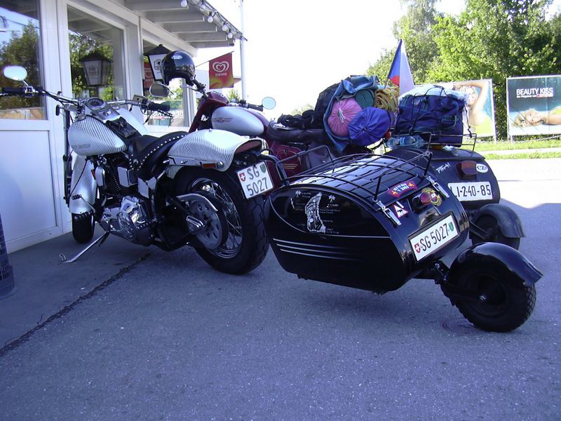 Je to krásný pocit sedět ve slunečném dni na břehu jezera a být naprosto svobodný. Člověk si může dělat co chce. Překvapilo mě, že nad Bodamským jezerem se dělají vyhlídkové lety vzducholodí. Když jsem dopsal deník, šel jsem na parkoviště pro motorku. Stálo to 5,40 Euro. To mě trochu zaskočilo, ale co se dá dělat. Další plánovaná zastávka bylo hlavní město Lichtenštejnska Vaduz. Jenže nebylo značený, tak jsem ho nemohl najít. Na okraji města Feldkirch jsem se zastavil, že se podívám do mapy a tu najednou slyším nějaké hvízdání. Otočím se a z jedné restaurace vyběhl kluk a hvízdal na mě. Otočil jsem mašinu a jel za ním. Říkal mi, že mi něco musí ukázat. Vzal mě do garáže tam mi ukázal Harley-Davidson s pávikem. Říkal, že ho má z Čech. Pak zavolal na přítelkyni a ta mi šla ukázat svůj Harley-Davidson s pávikem. Koukal jsem na to jak tele. Na dvoře jim ještě stál zrenovovaný Fiat 500. Oba byli majitelé restaurace, před kterou jsem zaparkoval.