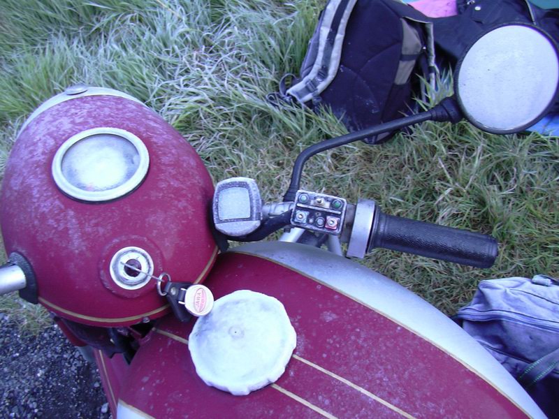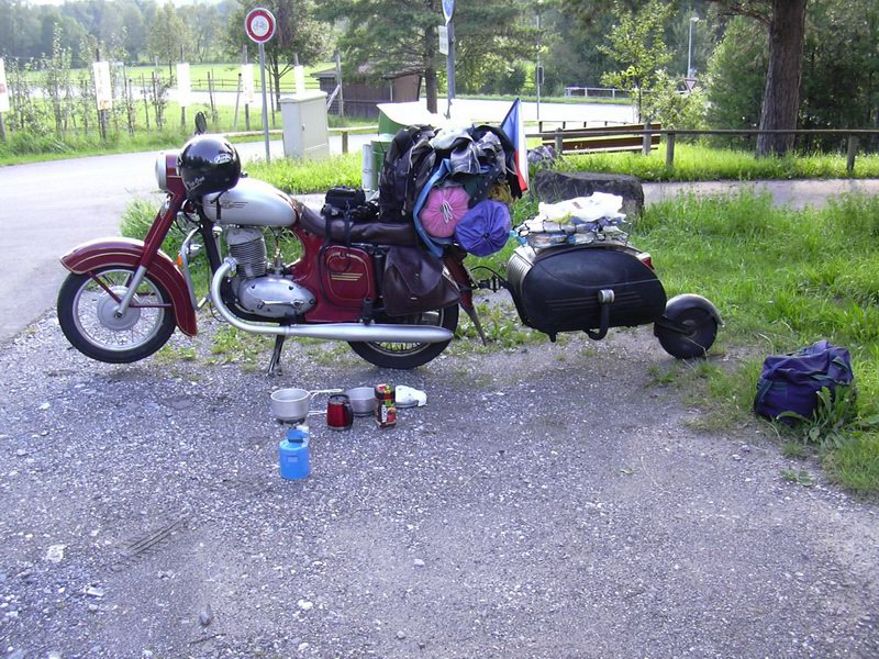 tento den byl zatím ze všech nejzajímavější a budu na něj hodně dlouho vzpomínat. Spal jsem asi do devíti. Než na cestu začalo svítit sluníčko. Byl jsem ještě trochu nervozní z motorky. Udělal jsem si snídani a přemýšlel o tom co, bude a co mě ještě čeká. K snídani bylo opět kafe a bábovka. Už mi zbývá jen kousek a bude snědená. Ještě jsem dal sušit spacák, protože byl mokrý od noci v Alpách.