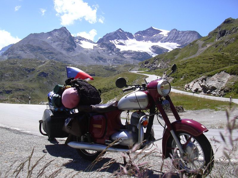 Naštěstí jsem to zvládnul a Kristýna taky. Tohle byl opravdový test spolehlivosti. Jel jsem přímo k tunelu, který mi Frank doporučil. Provoz v tunelu byl kyvadlový. Stál sice 7 Eur, ale stálo to za to. Za tunelem na mě čekala přehrada s křišťálově čistou vodou. Byla to opravdová nádhera. Za přehradou byla státní hranice Švýcarsko-Itálie. Kolem přehrady se jelo takovým na půl tunelem, takže bylo krásně vidět ven. Hned za tunelem byla malá italská restaurace a místo na pikniky. Jelikož jsem nesnídal, rozhodnul jsem se, dát si pauzu na oběd. Dal jsem si bábovku, kousek čabajky a kafe. Je tu fantastický klid. Zapovídal jsem se s jedním Němcem, ptal se opět na Jawu. Říkal, že ji měl taky a že ho nová stála 3000 východoněmeckých Marek. Taky říkal, že se na ní dá všechno opravit. Do Čech jezdí pravidelně, protože má u Sokolova známý. Jdu ještě udělat pár fotek a razím dál. Už bych se chtěl konečně vykoupat a umýt a taky na chvíli shodit boty.