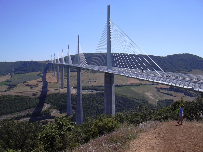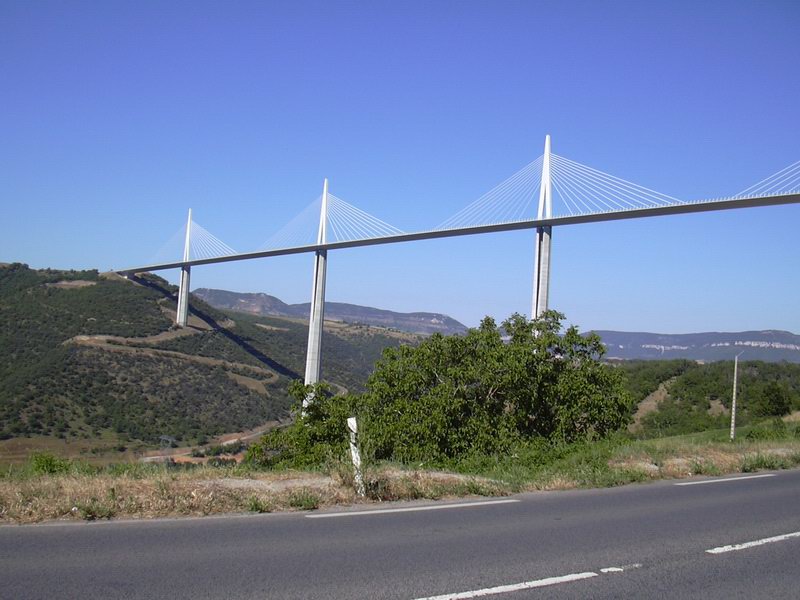 Z města Florac jsem se vydal skrz národní park dlouhým kaňonem do Millau. Tam už na mě čekal nejvyšší most na světě. Kaňon byl fantastický. Bylo se pořád na co dívat. Musel jsem být opatrný, protože cesta byla ouzká a samá zatáčka. Celý včerejší den bylo hrozné teplo. Připadal jsem si, jak když jedu v peci. Bylo asi 35°C ve stínu. Motorka i já jsme to zvládali. Když už jsem byl kousek od mostu (podle mapy), najel jsem na dálnici, protože jsem si chtěl most přejet. Samozřejmě jsem, ale najel na blbou stranu, takže jsem se musel asi po 10 km otočit a jet zpět. Za přejezd mostu se platilo 7 Euro a motorka 3,5 Euro. I za tuto cenu to stojí za to. Je to jako, když jedete v nebi. Most je dlouhý 2,5km. Po přejetí mostu jsem sjel z dálnice a jel jsem se na most podívat blíže. Chtěl jsem udělat ještě nějaké fotky.