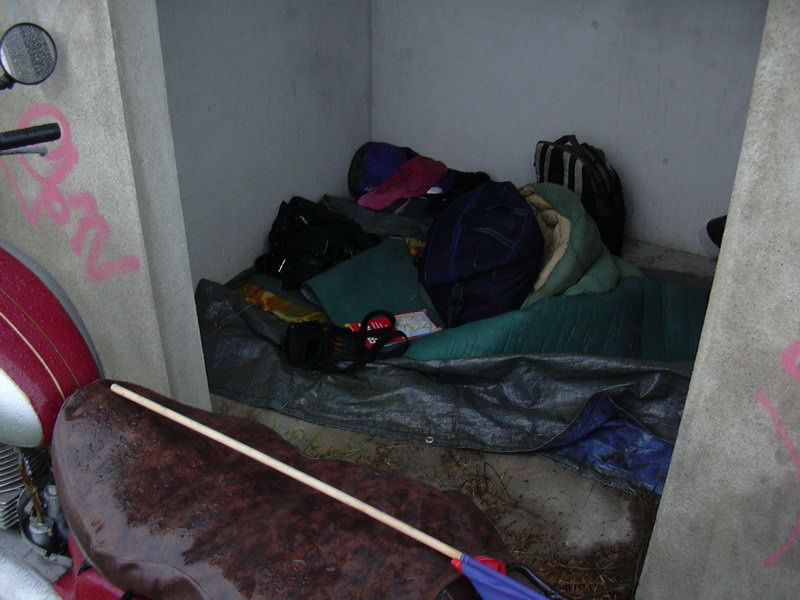 Rozloučili jsme se a já si šel vypít to kafe. Pak jsem vytáhnul tašku s věcma a karimatku, abych měl na čem spát. Ještě jsem si pustil MP3, aby se mi lépe usínalo. Hrozně mě štvaly projíždějící auta. Asi po půl hoďce mi byla zima, tak jsem se přikryl dekou. Bylo něco kolem jedenáctý. Ve dvě jsem se probudil zimou a musel jsem nutně na záchod. Skočil jsem si za zastávku. Pak jsem vbalil spacák a na tvrdo jsem usnul.